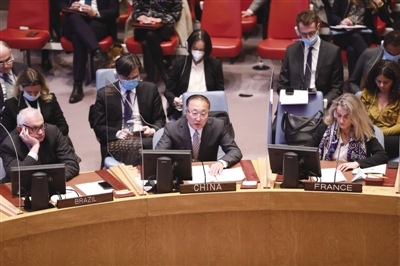 中国常驻联合国代表张军(前排中)在安理会乌克兰局势公开会上发言。 新华社记者 谢锷/摄