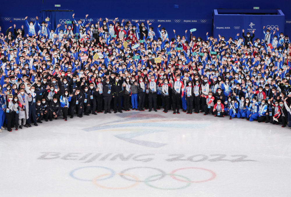 工作人员和志愿者在北京首都体育馆合影留念。