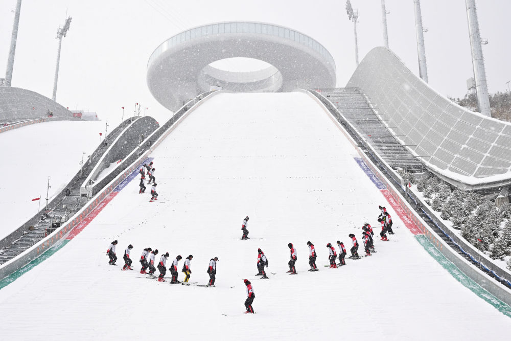 工作人员在国家跳台滑雪中心“雪如意”整理赛道。“雪如意”的设计借鉴了传统文化符号“如意”。