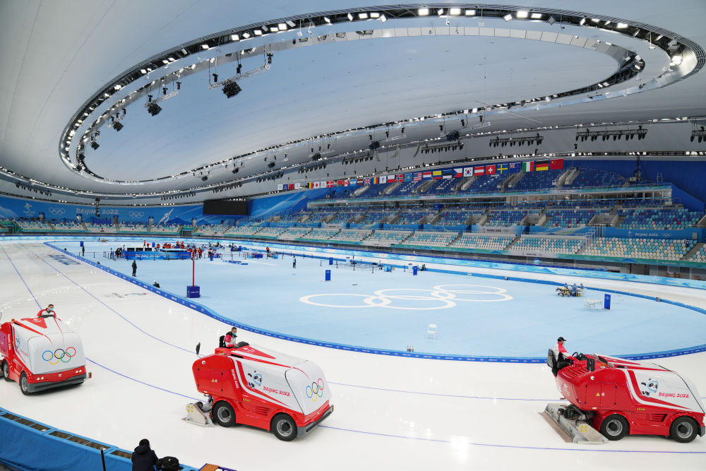 浇冰车在国家速滑馆“冰丝带”作业。被称赞为“最快的冰”的“冰丝带”在北京冬奥会期间见证多项纪录诞生。