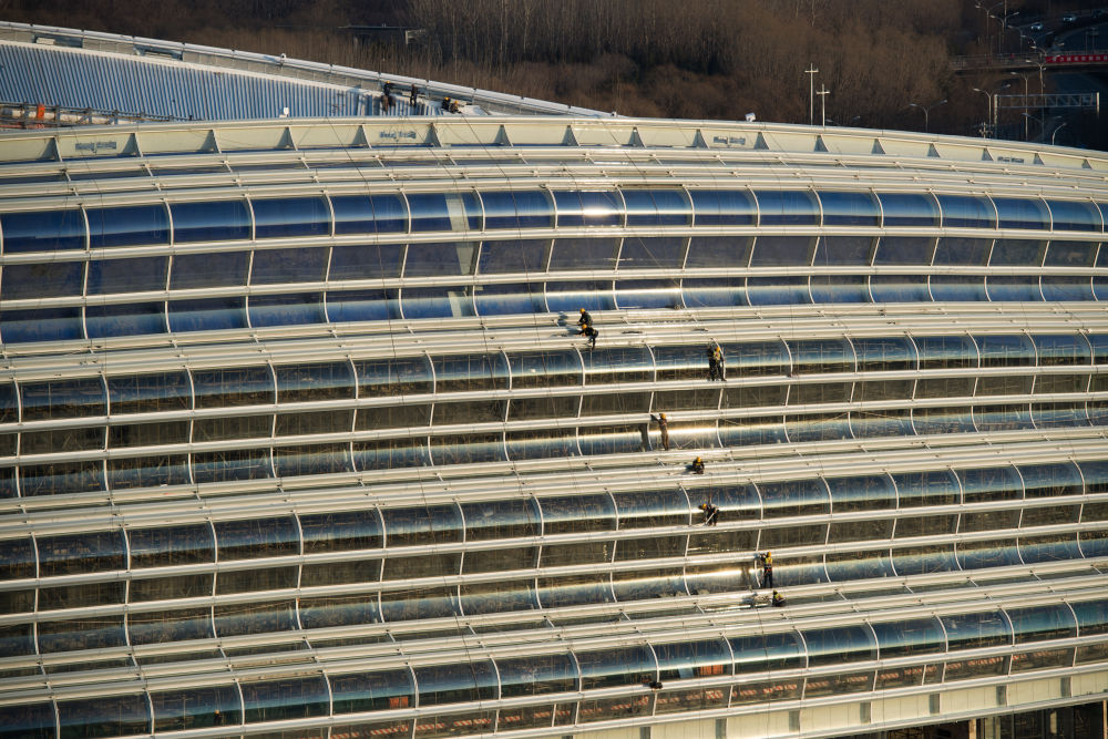 施工人员在实现封顶封围的国家速滑馆“冰丝带”现场工作。