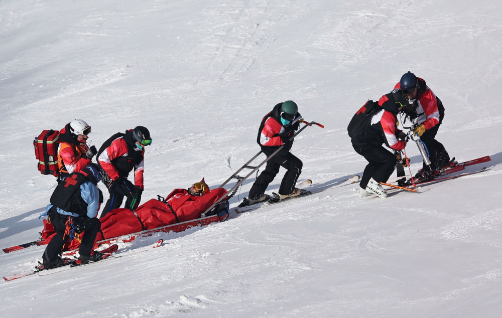 在延庆国家高山滑雪中心,高山滑雪医疗队队员用雪橇船将选手带离赛道救治。