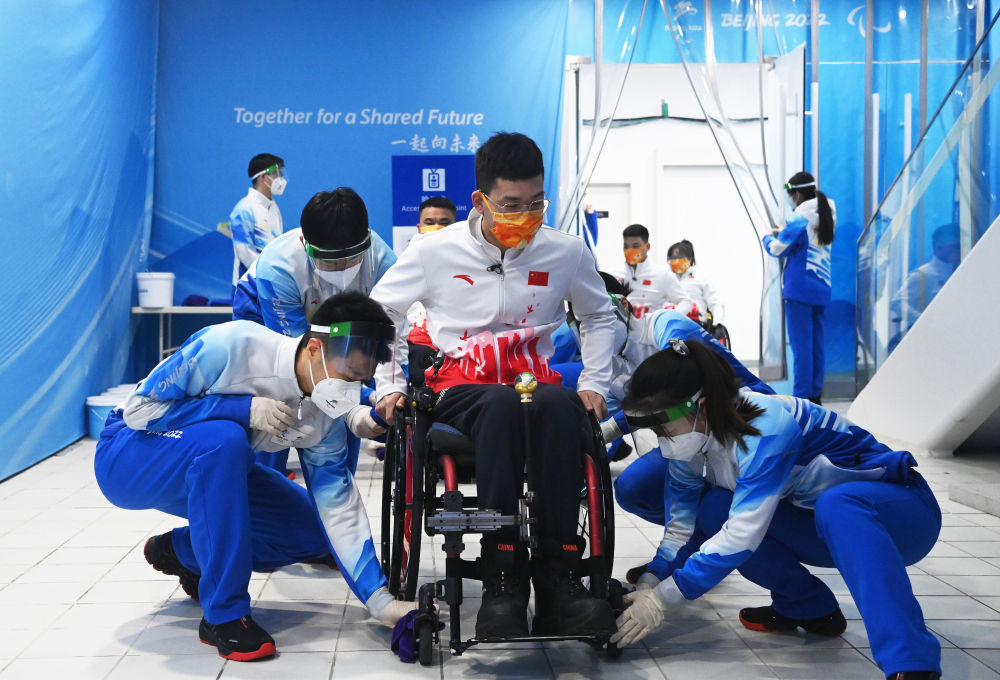 北京冬残奥会志愿者为选手清洁轮椅。