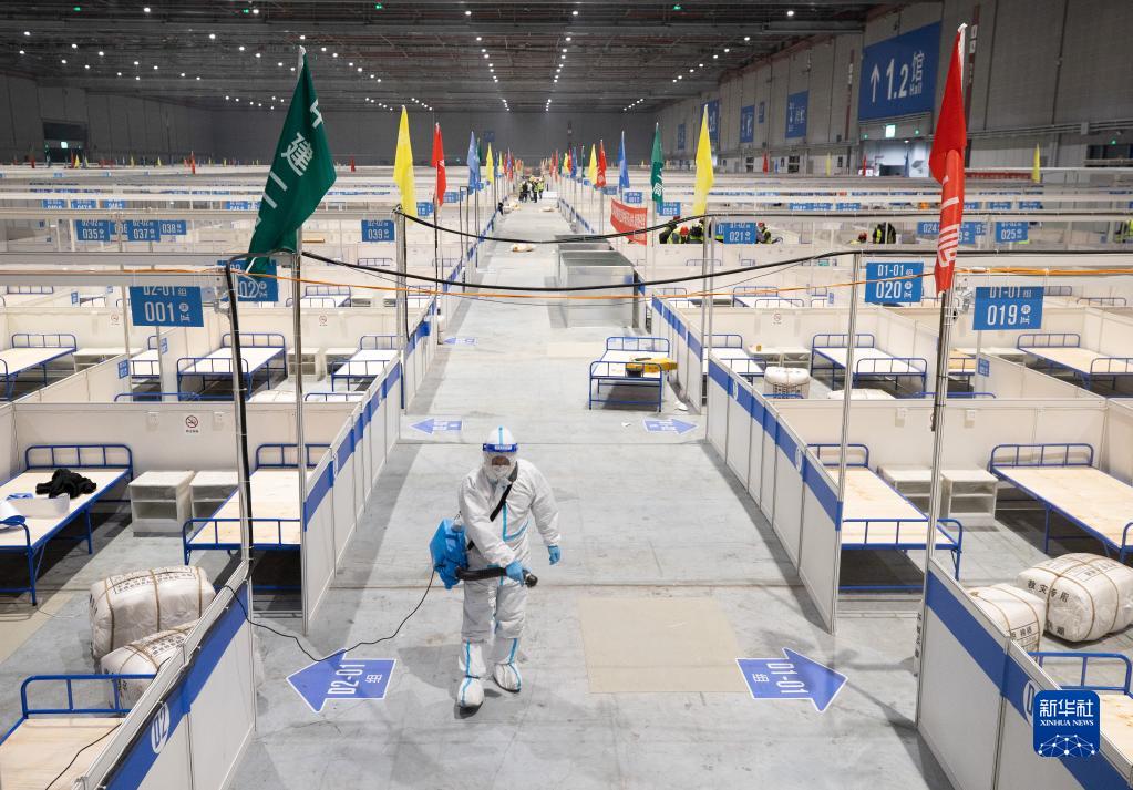 4月8日,工作人员在国家会展中心(上海)方舱医院进行消杀处理。新华社记者 金立旺 摄