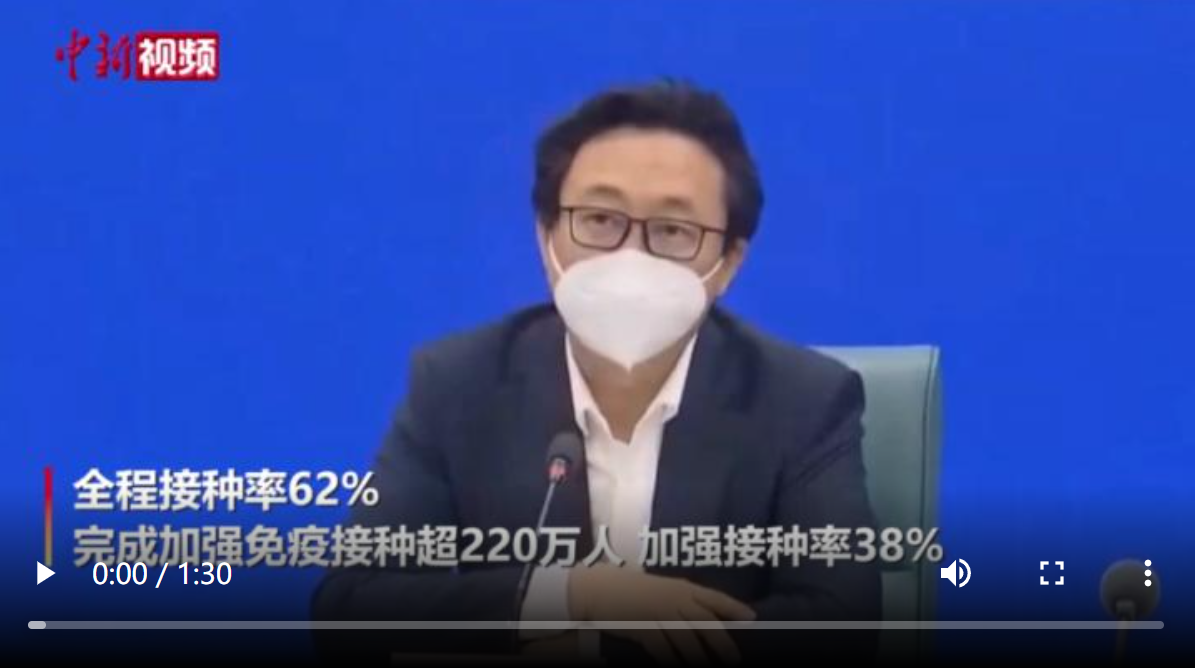 4月28日,在上海新冠肺炎疫情防控新闻发布会上,上海市卫生健康委副主任赵丹丹介绍,截至目前,上海60岁及以上老年人累计完成新型冠状病毒疫苗全程接种超360万人,全程接种率62%,完成加强免疫接种超220万人,加强接种率38%。