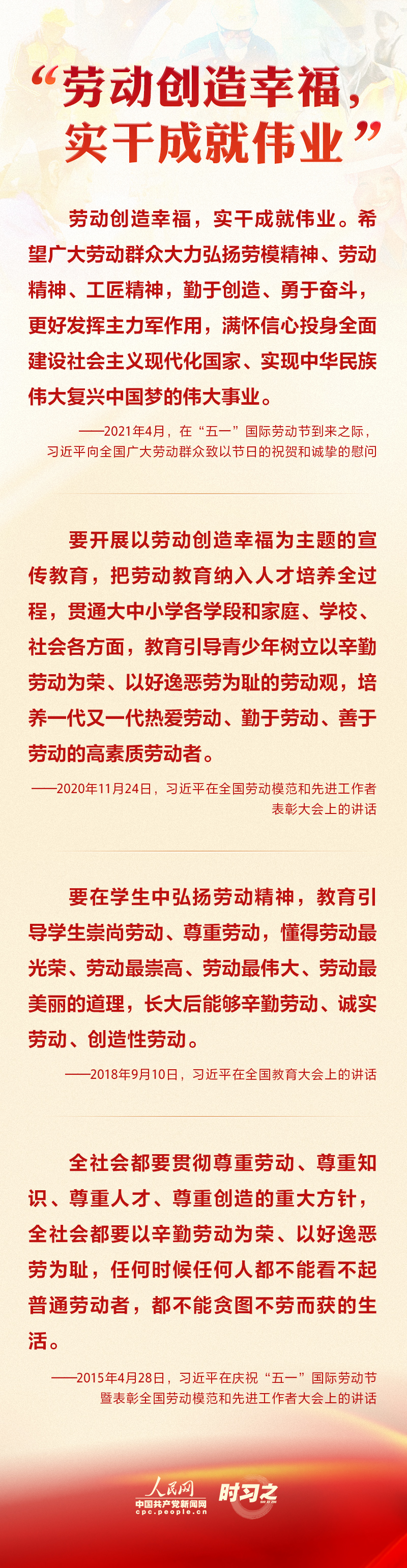 劳动创造幸福,实干成就伟业。习近平总书记始终心系全国广大劳动者,提倡弘扬劳动最光荣、劳动最崇高、劳动最伟大、劳动最美丽的社会风尚。在“五一”国际劳动节到来之际,让我们牢记总书记的殷殷嘱托,树立正确的劳动观。