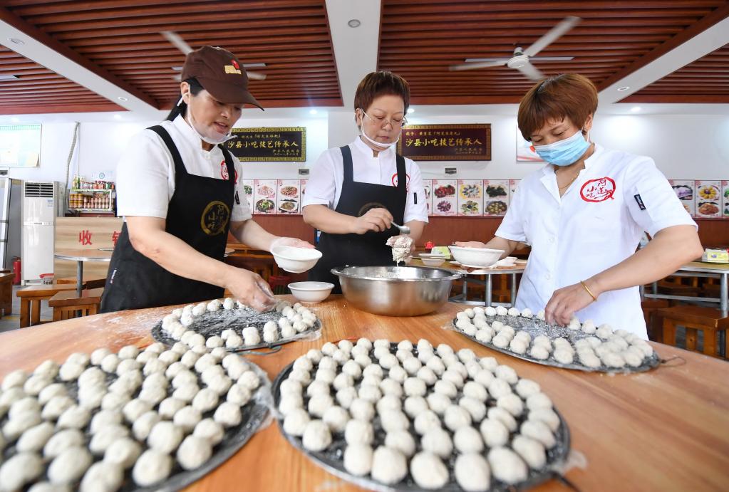 2021年6月11日,在福建三明市沙县区,阿莲豆腐丸技艺传承人黄秀莲(中)和同事一起制作滚粉豆腐丸。新华社记者林善传摄