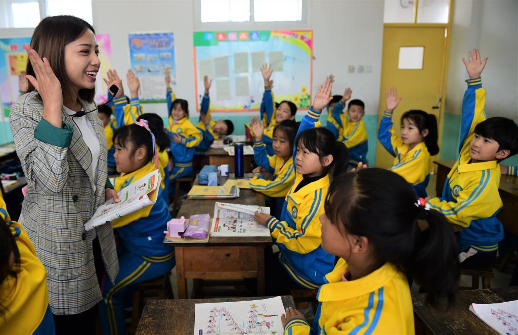 2021年9月26日,在河北省盐山县小营乡大左中心小学,新来的特岗教师王婷婷为三年级的学生上英语课。2021年,盐山县选拔招聘了244名特岗教师。新华社发(傅新春 摄)