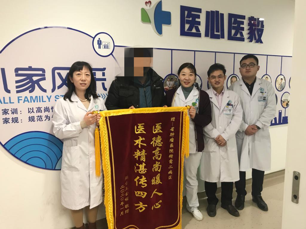 孟雪(左一)与团队成员共同接受患者赠送的锦旗。山东省肿瘤医院供图