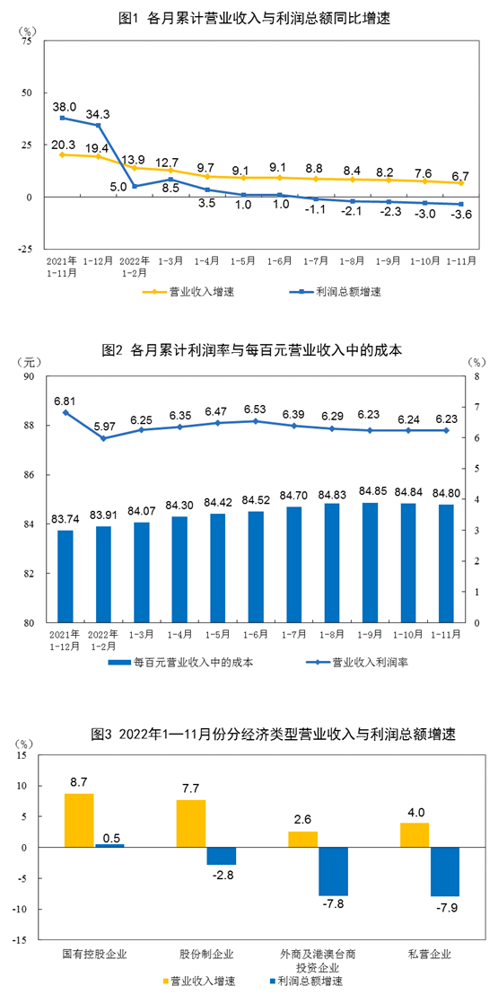 国家统计局工业司高级统计师朱虹表示,11月份,受疫情反弹和需求不足等因素影响,工业生产有所放缓,企业经营压力加大,但利润结构持续改善。具体来看,1—11月份工业企业效益状况主要呈现以下特点: