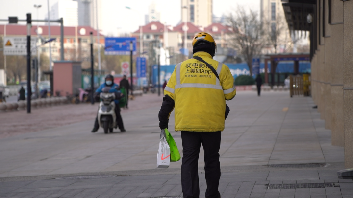图为一位外卖骑手正在送餐。(方金洋摄)
