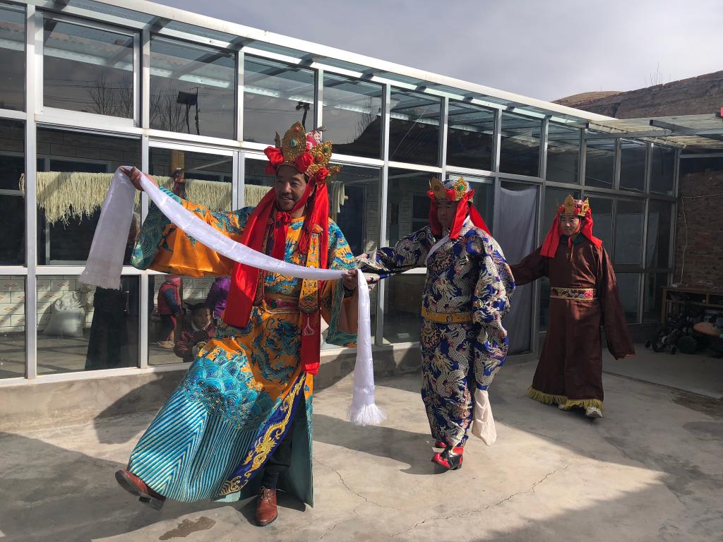 多杰扎西(左一)在自家院子里排练藏戏。新华社记者白玛央措 摄