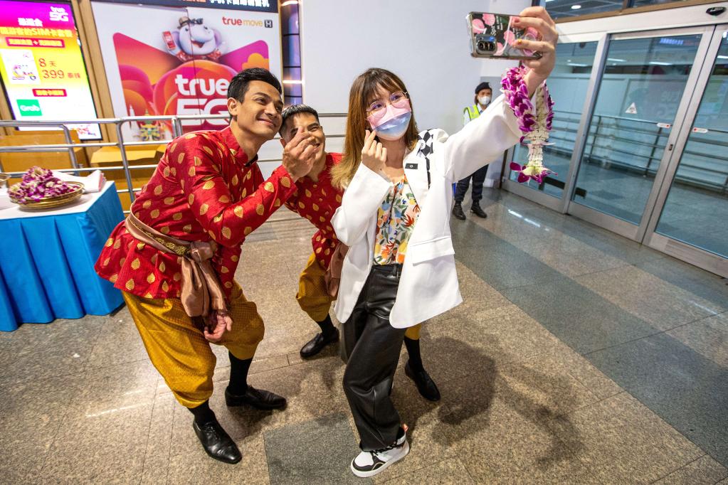 2月6日,在泰国曼谷廊曼国际机场,一名中国游客与工作人员自拍。新华社记者王腾摄