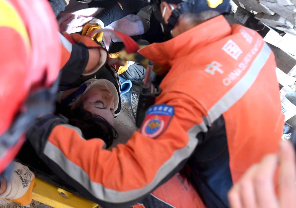 记者在现场看到,获救者十分年轻,身上盖着搜救队员提供的毛毯,戴着护颈,面色惨白,搜救人员小心翼翼地将她抬上救护车送往医院治疗。