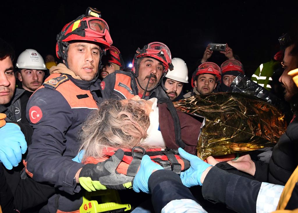 2月9日,在土耳其哈塔伊省安塔基亚市,中国救援队与土耳其救援队转移一名救出的女性幸存者。新华社记者沙达提摄