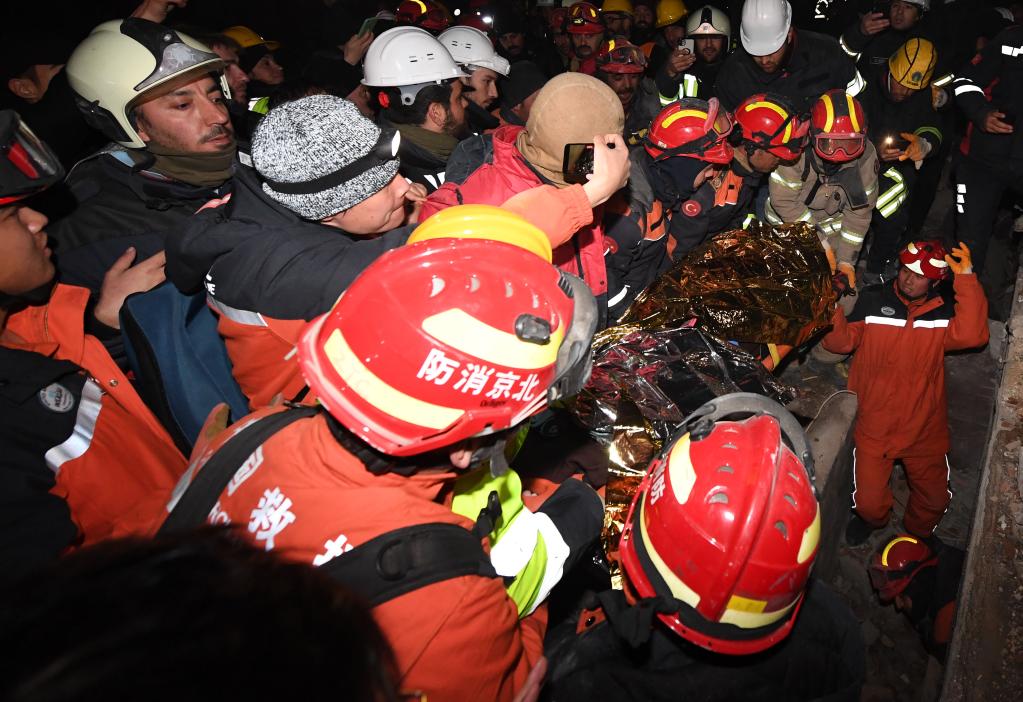 2月9日晚,在土耳其哈塔伊省安塔基亚市,中国救援队与土耳其救援队合力营救出的幸存者被抬出废墟。新华社记者沙达提摄