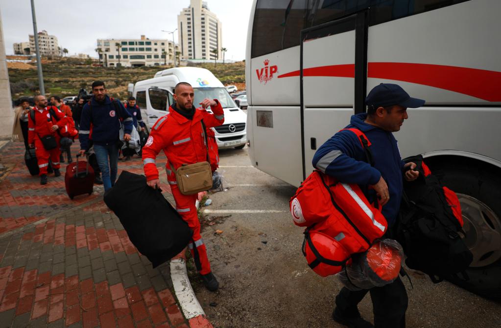 2月9日,在约旦河西岸城市拉姆安拉,巴勒斯坦救援队队员准备启程奔赴震区。新华社发(艾曼·诺巴尼摄)