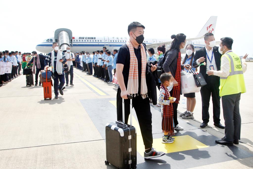 7日,一架载有125名乘客的中国国航航班在柬埔寨首都金边国际机场徐徐穿过水门。飞机“过水门”仪式寓意给来客“接风洗尘”,属国际民航中最高规格礼遇。伴随热情的柬埔寨传统昌扬舞,柬埔寨旅游大臣童昆等人向乘客逐一送上传统水布和花环。