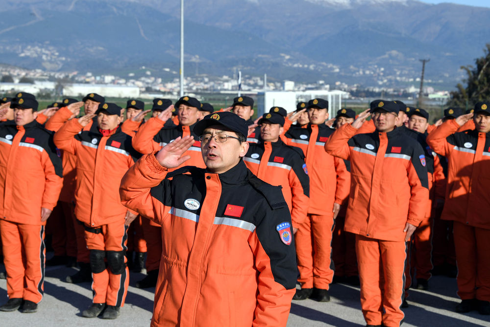 2月10日,中国救援队队员在土耳其哈塔伊省安塔基亚市的驻扎营区参加升旗仪式。