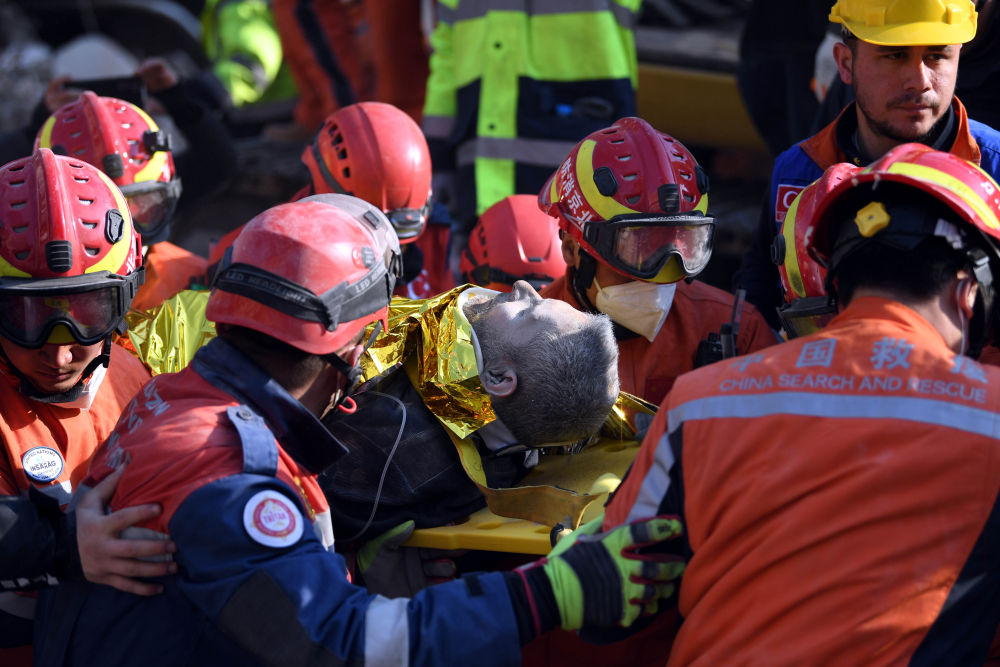 2月12日,在土耳其哈塔伊省安塔基亚市,中国救援队转移一名救出的幸存者。