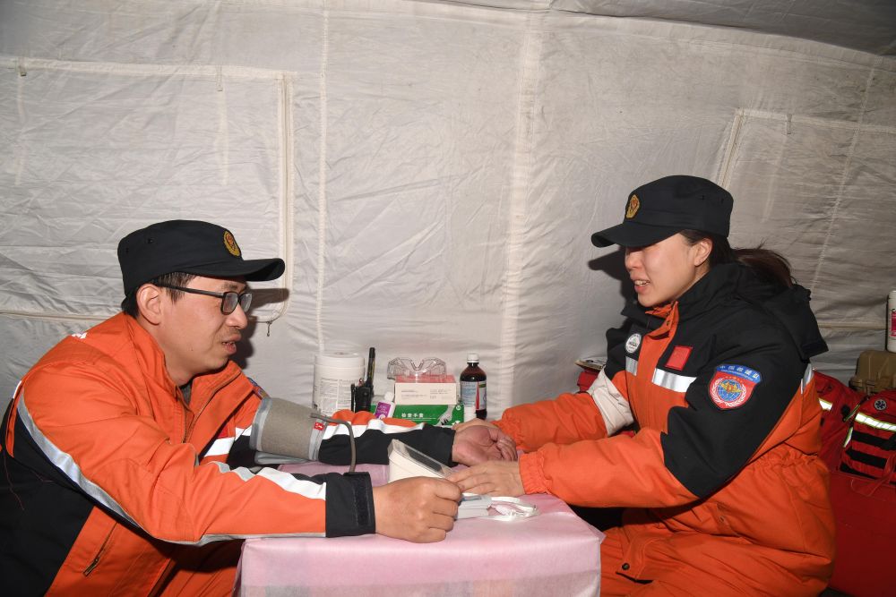 2月13日,在位于土耳其哈塔伊省哈塔伊体育馆外的中国救援队营地,医生为救援队成员检查身体。