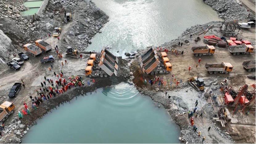 达苏水电站截流现场航拍。(中国能建葛洲坝集团巴基斯坦达苏水电站项目部供图)