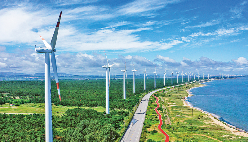 近年来,山东省荣成市坚持高质量绿色发展理念,推进风力发电、光伏发电等绿色经济产业发展,优化能源结构,助力推进碳达峰碳中和,实现生态保护和可持续发展。图为2021年8月24日,荣成市北部海湾附近,风力发电机组在运转发电。求是图片 李信君/摄