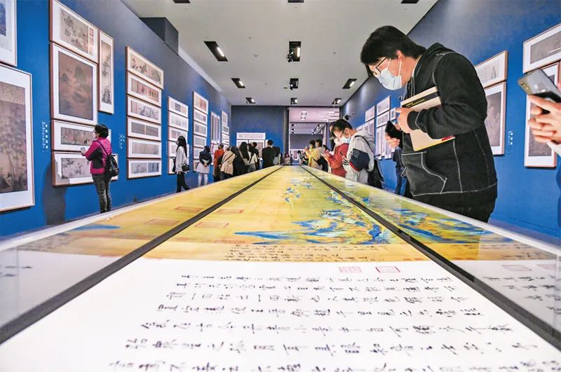文化遗产中,有万千气象、民族自信。中国国家博物馆展出的“盛世修典——‘中国历代绘画大系’成果展”,将穿越千年的丹青、散落全球的国宝通过高清打样图像汇聚一堂。图为2022年10月26日,观众在欣赏多媒体版的《千里江山图》灯光特效图。 视觉中国供图