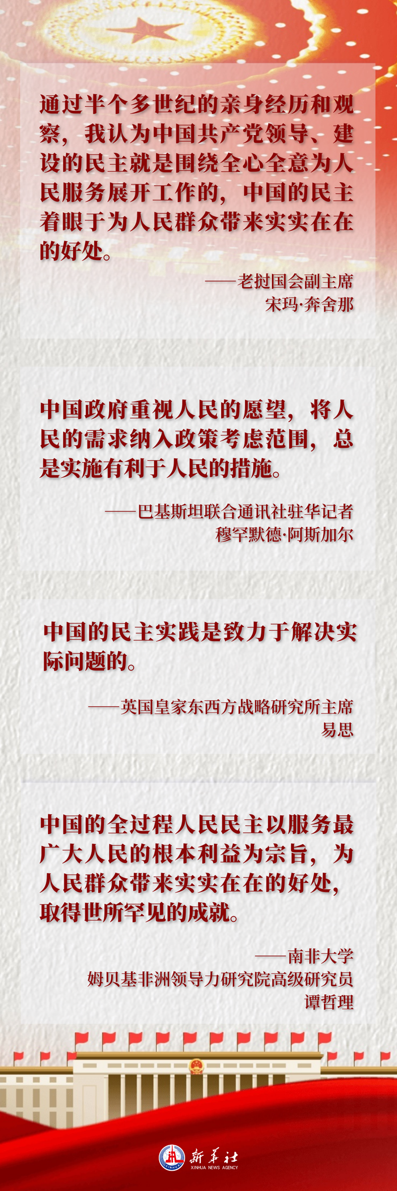 通过两会代表委员的广泛代表性确保人民当家作主,通过全面听取人民声音更好地为人民服务,这是不少海外专家透过两会观察中国全过程人民民主时得出的结论。