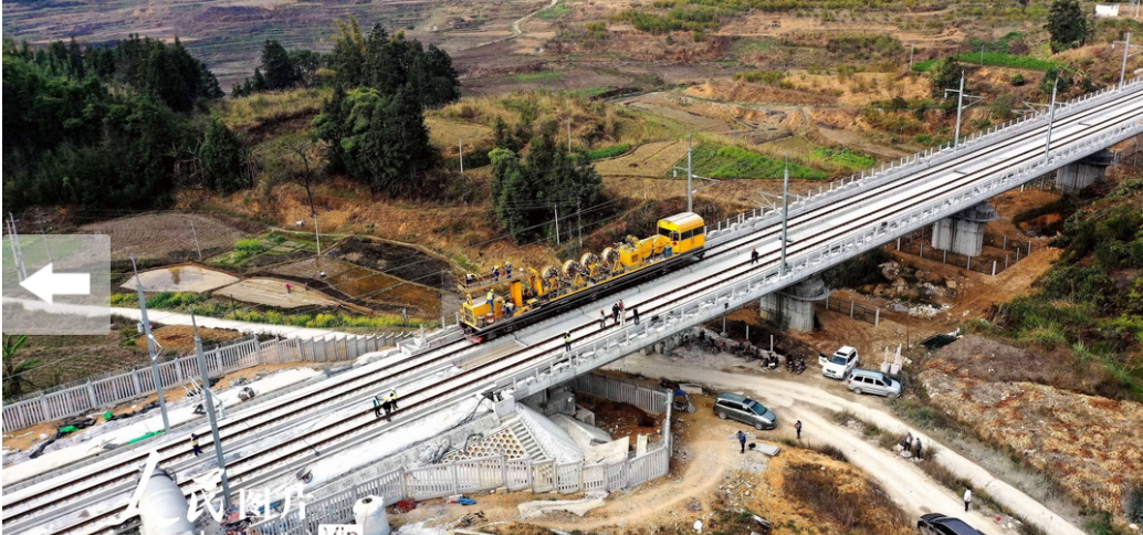 2023年3月10日,广西环江毛南族自治县境内的贵南高铁九万大山四号隧道,10名铁路建设者操作恒张力架线车完成最后一个锚段1.35条公里接触网导线架设,标志着贵南高铁广西段接触网较原计划提前半个月全部贯通。