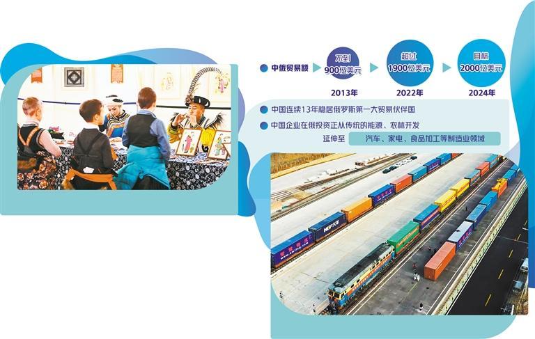 中俄经贸关系不断升级。10年来,中俄贸易额持续增长,从2013年的不到900亿美元提升到2022年的超过1900亿美元,正提前接近两国元首确立的2024年实现贸易额2000亿美元目标,中国连续13年稳居俄罗斯第一大贸易伙伴国。中国企业在俄投资正从传统的能源、农林开发延伸至汽车、家电、食品加工等制造业领域。
