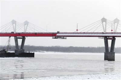 中俄首座跨界江公路大桥的中俄双方接合位置。大桥起点位于黑龙江省黑河市,终点位于俄罗斯布拉戈维申斯克市。