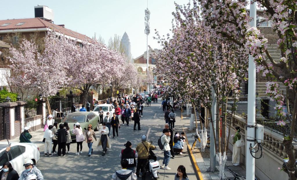 清明节前夕,和煦的春风吹开了天津市和平区五大道景区的海棠花,将一栋栋小洋楼间的各色小店装点得格外美丽。