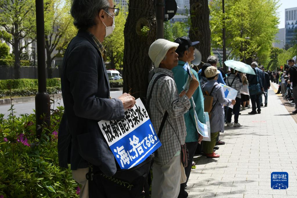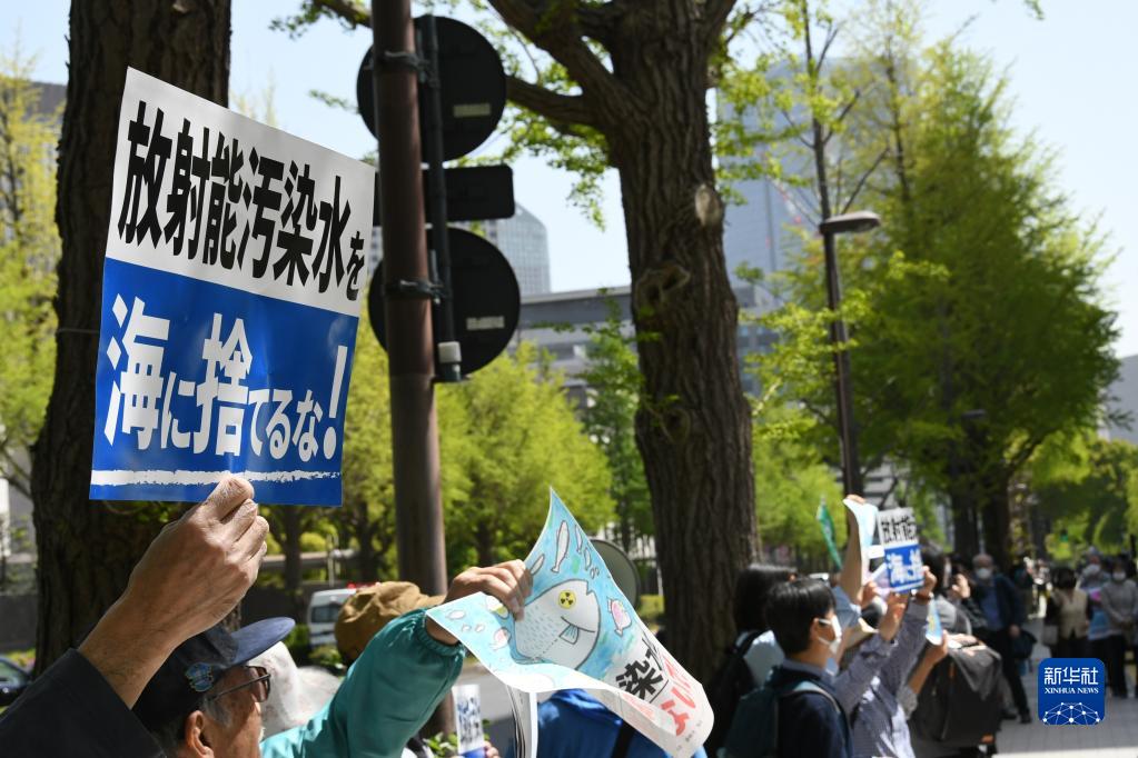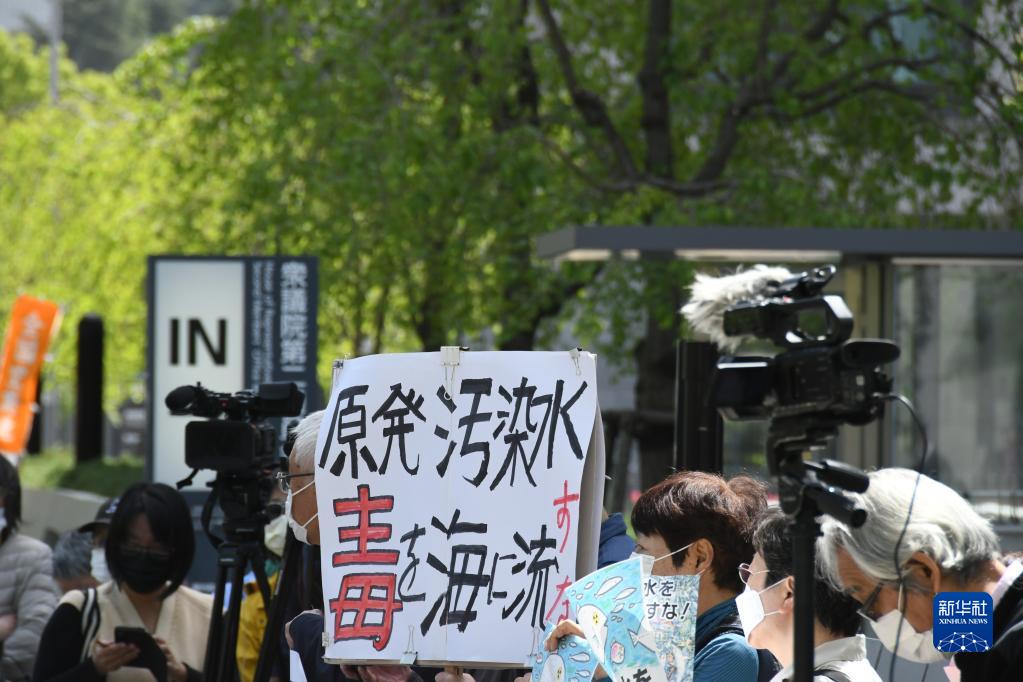 4月13日,在日本东京,民众手举标语在日本国会众议院第二议员会馆前参加集会抗议。新华社记者 岳晨星 摄