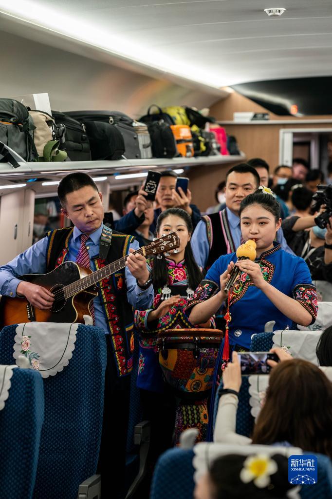 4月13日,乘坐首发列车的旅客在车上欣赏歌舞表演。新华社记者 胡超 摄