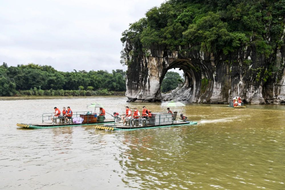 游客在广西桂林乘坐竹筏游览象鼻山(2022年6月29日摄) 曹祎铭摄/本刊