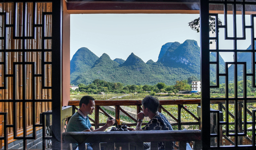 游客在广西桂林市阳朔县一家民宿喝茶聊天(2020年7月4日摄) 曹祎铭摄/本刊