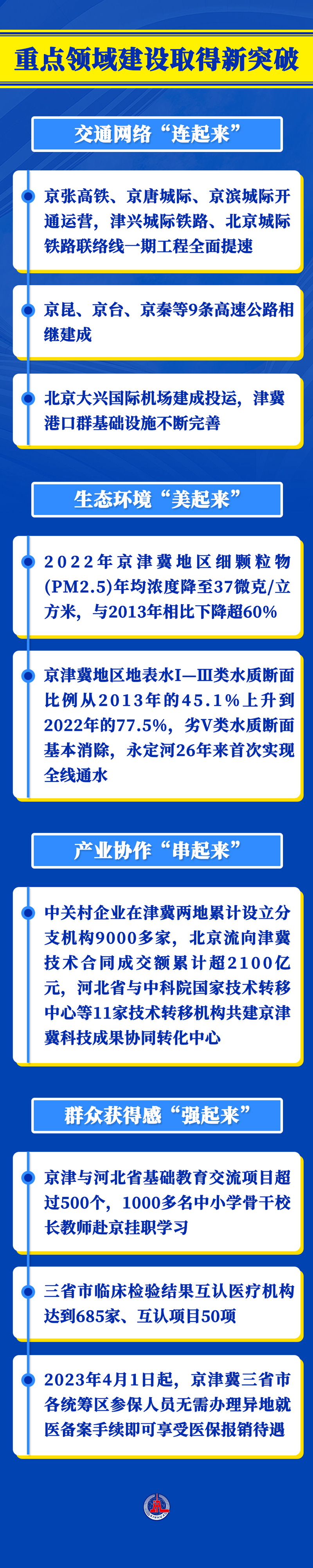 京津冀协同发展是一个系统工程。9年多来,三地携手发力,重点区域协同发展步稳蹄疾,交通、环境、产业、公共服务等重点领域建设不断取得新突破。