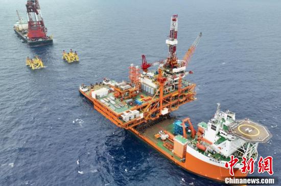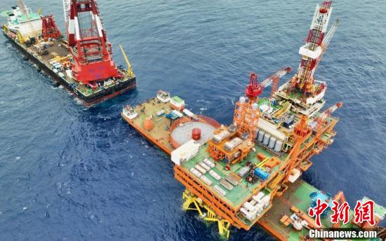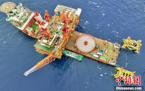 5月13日,距深圳200多公里海域,中国海油深圳分公司超1.5万吨“恩平20—4”海上钻采平台上部组块与导管架对接成功,创造了中国海上油气平台动力定位浮托安装重量的新纪录,同时填补中国动力定位浮托自主设计安装技术空白。(无人机照片)