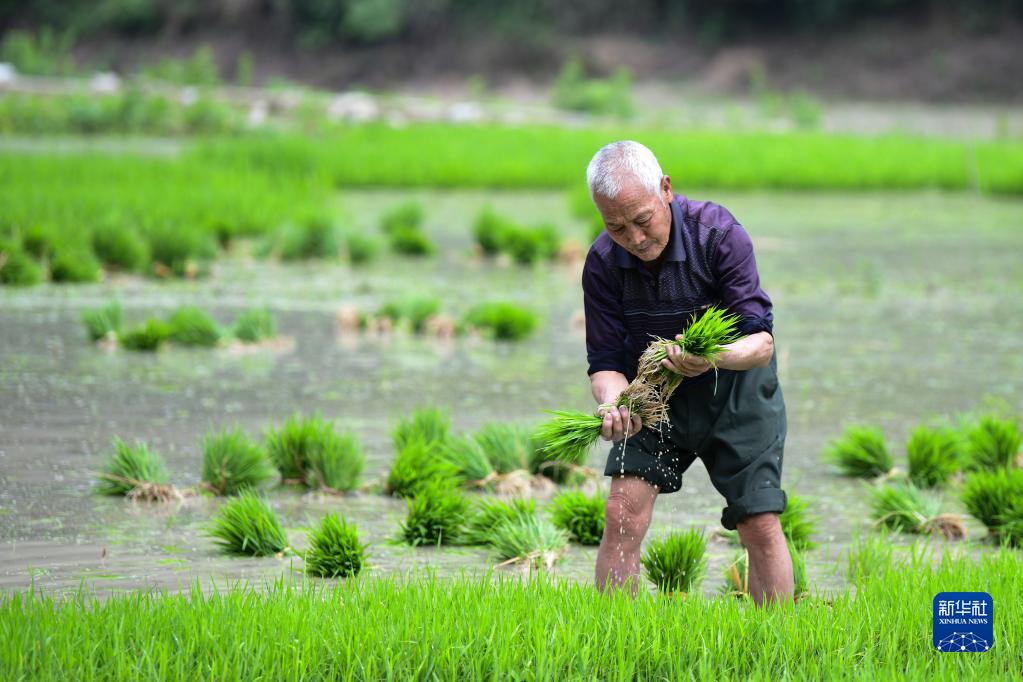 初夏时节,各地稻田里一派忙碌的景象,农民们抢抓农时,移栽秧苗、育秧插秧。新华社发(王超 摄)
