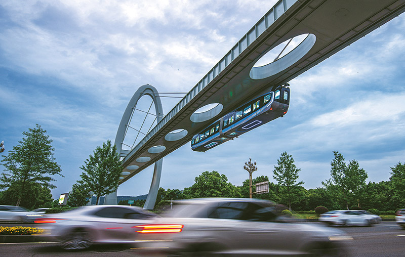 列车悬挂在轨道下方,从人们头顶飞驰而过,这样的科幻场景,最近在武汉东湖新技术开发区成了现实。图为2023年5月9日,武汉“光谷光子号”空轨列车在综合联调和试运行中。 新华社记者 肖艺九/摄