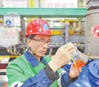 轻拧阀门,加入适量化学试剂,随着设备的轰鸣声响起,潘从明(见上图,本报记者赵帅杰摄)紧盯温度计上的刻度变化,不时从反应釜中舀取少量溶液,观察颜色、测量酸度,随后掏出手机计算投入产出比。“没问题!”他简短有力的话语,让身旁的同事松了一口气。