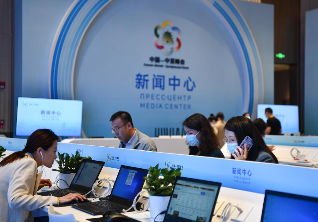 中国—中亚峰会18日至19日在西安举行。在峰会新闻中心,来自不同国家的新闻记者紧张而有序地忙碌着。