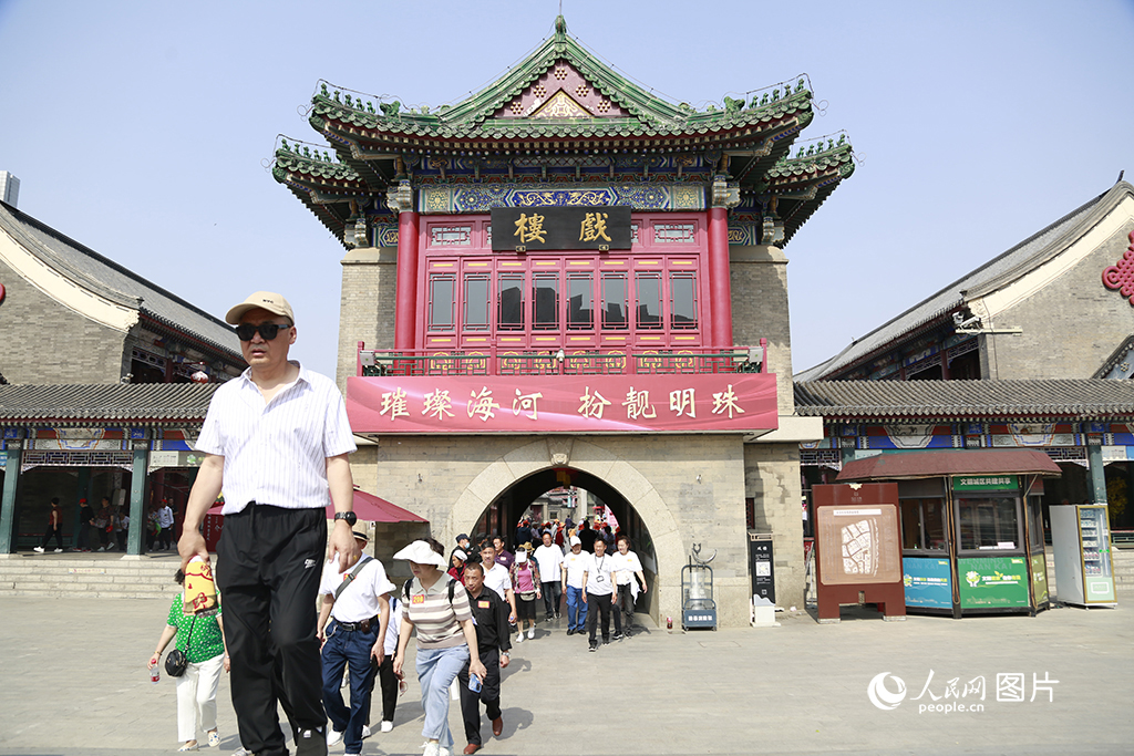 天津古文化街位于海河西岸,是国家5A级旅游景区、津门十景之一。5月16日,旅客从古文化街的戏楼走出。人民网 崔新耀摄