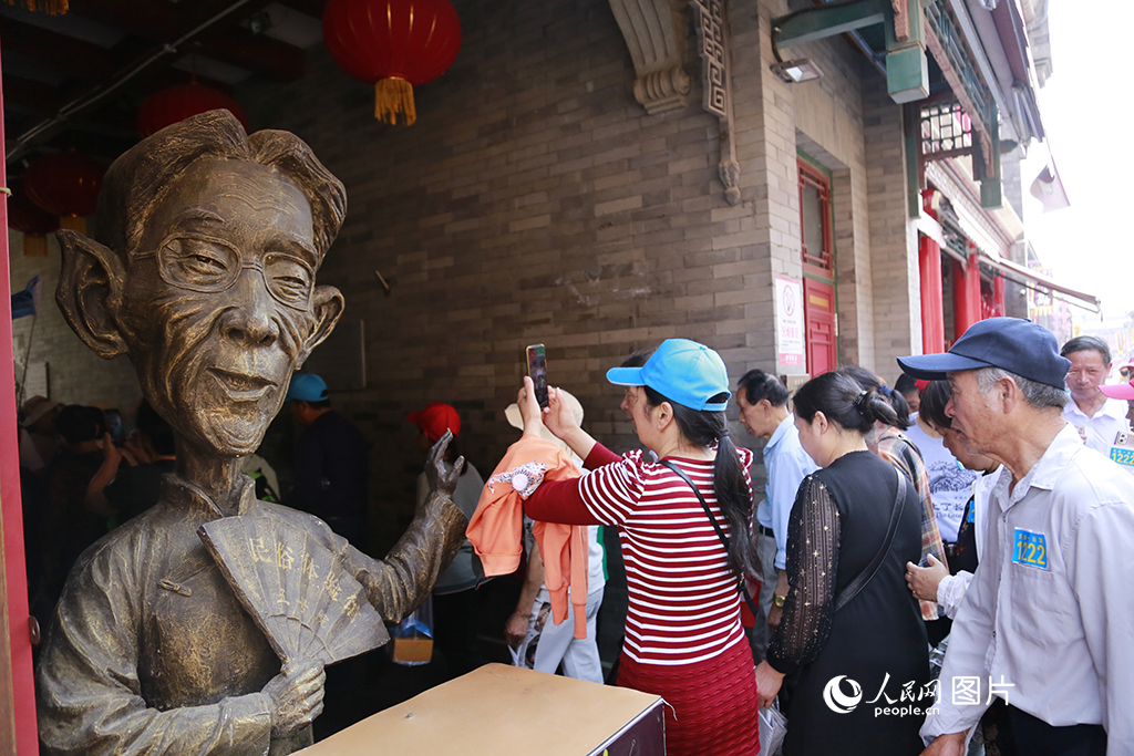 天津古文化街位于海河西岸,是国家5A级旅游景区、津门十景之一。5月16日,游客从相声大师马三立的雕塑旁走过。人民网 崔新耀摄