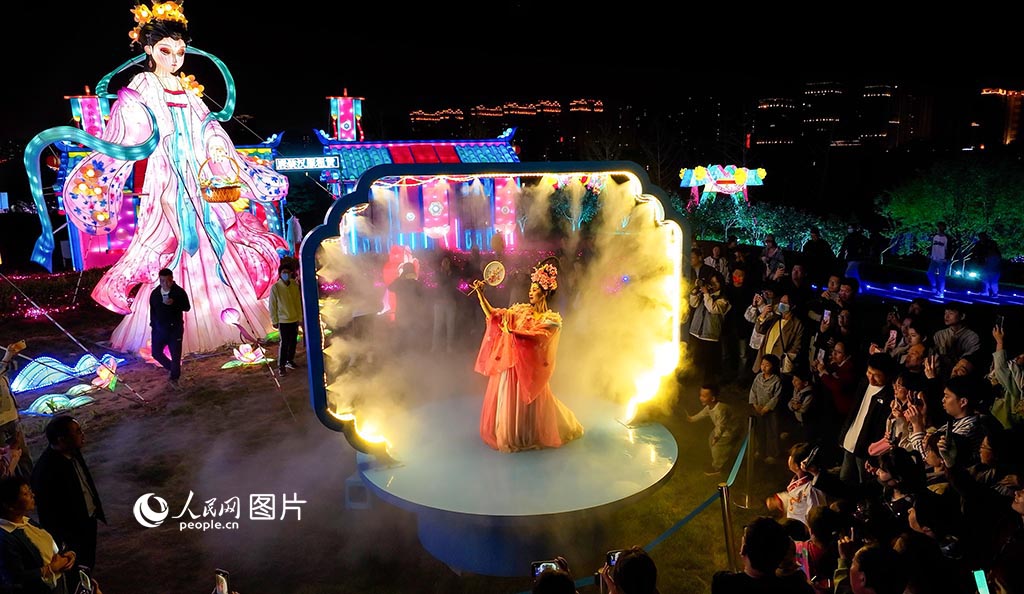 5月15日晚,山西太原晋阳湖桃花岛,精彩的舞蹈演出和美轮美奂的灯组装置吸引众多游客观赏。人民网记者 王帆摄