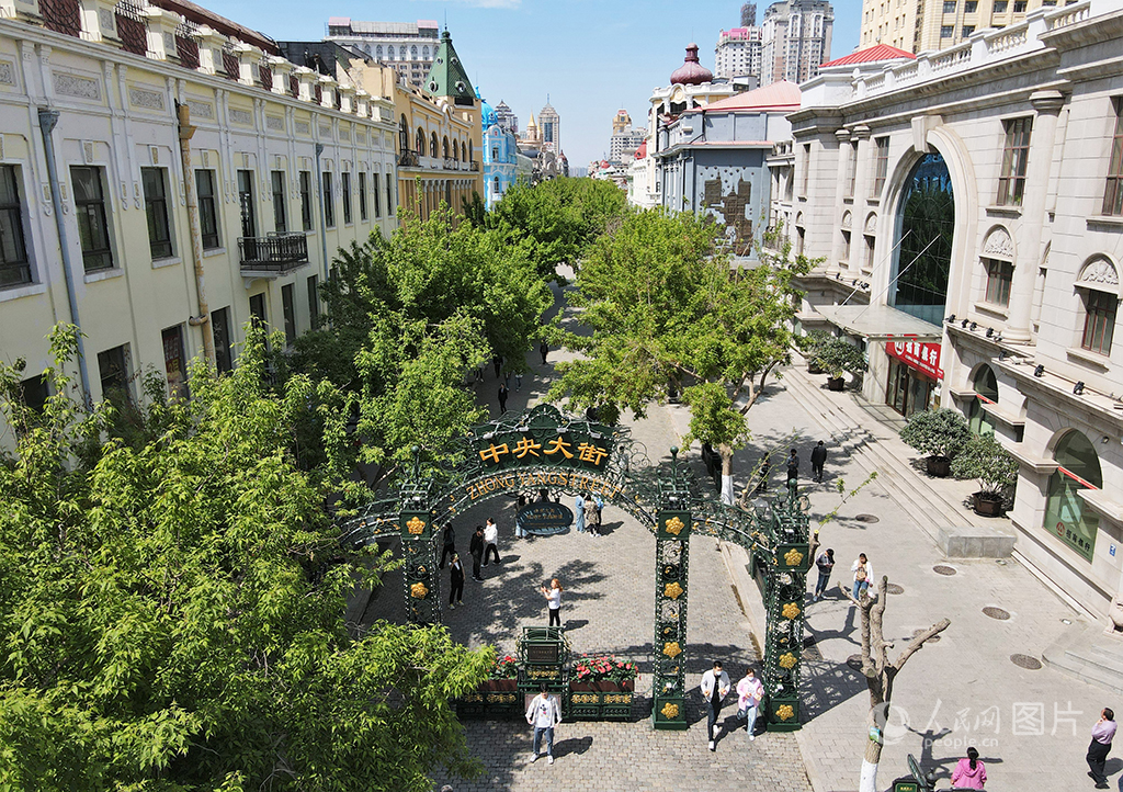 5月17日,游人漫步在哈尔滨市中央大街,感受百年老街的欧陆风情,尽赏冰城的夏日风光。人民网 苏靖刚摄