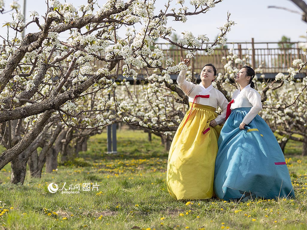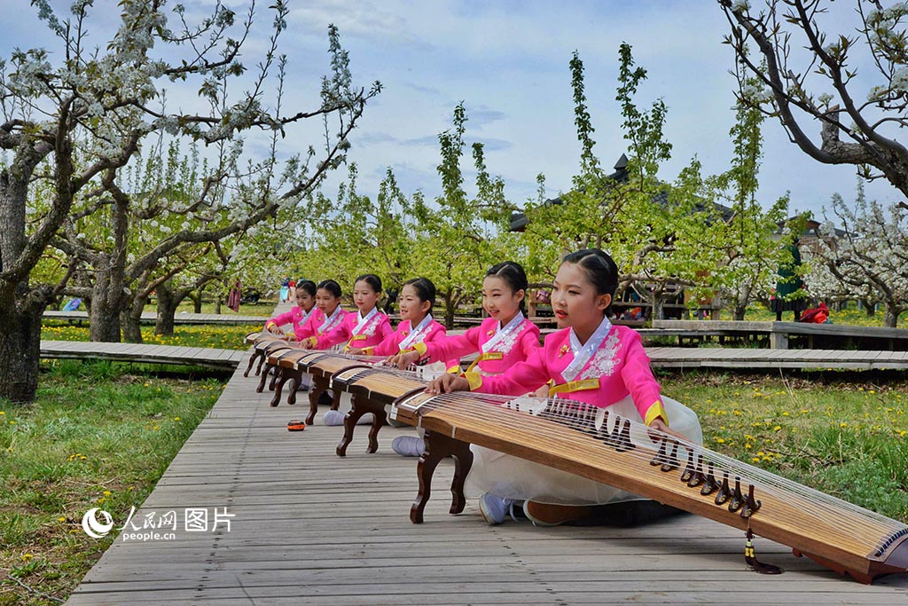 5月11日,吉林省延边州龙井市万亩梨园迎来梨花盛开期。走在梨树下,游客们载歌载舞,弹琴赏花,拍照留念。人民网 李洋摄