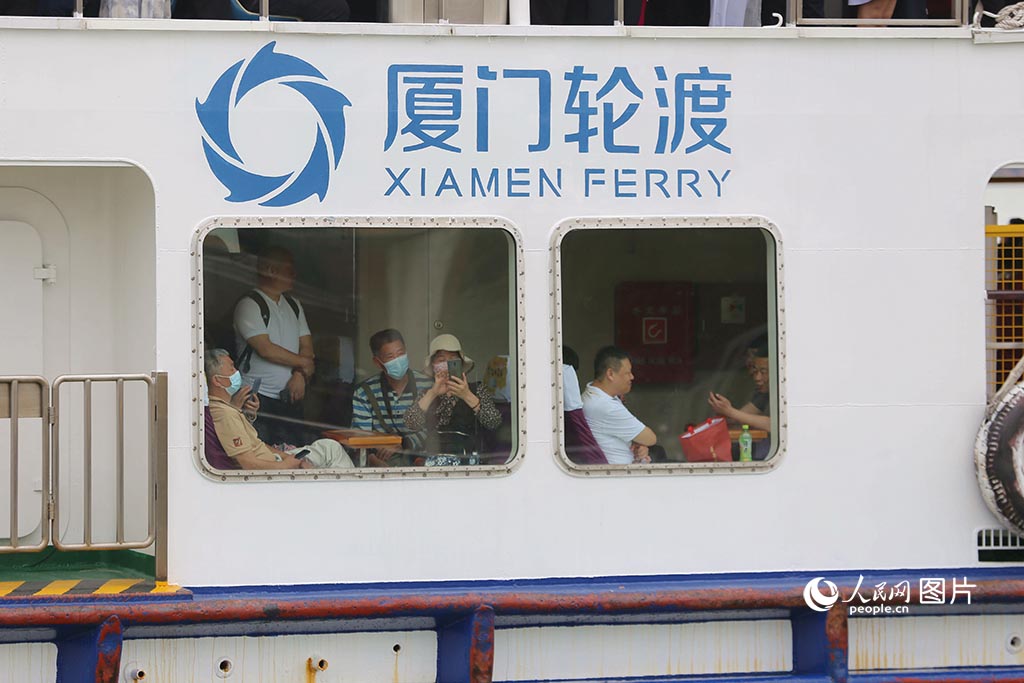 5月14日,厦门轮渡船停靠鼓浪屿内厝澳码头,船舱里的游客迫不及待地拿起手机拍照。人民网记者 陈博摄
