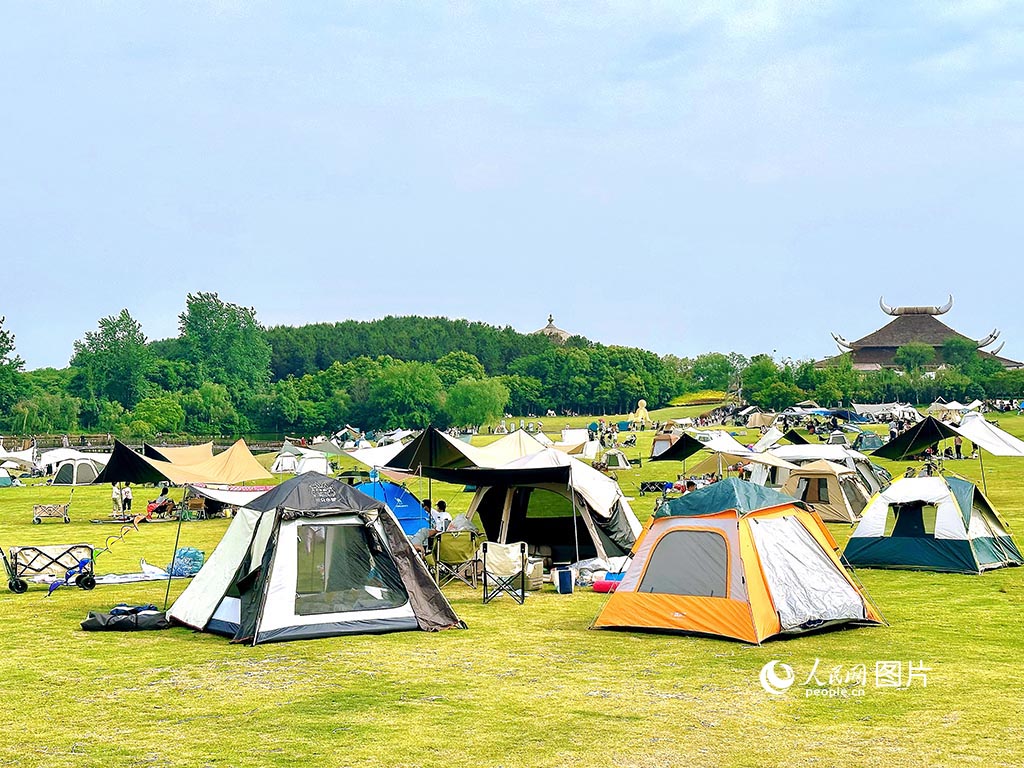 5月13日,众多游客在位于武汉市黄陂区王家河镇的木兰草原景区露营。人民网记者 张沛摄